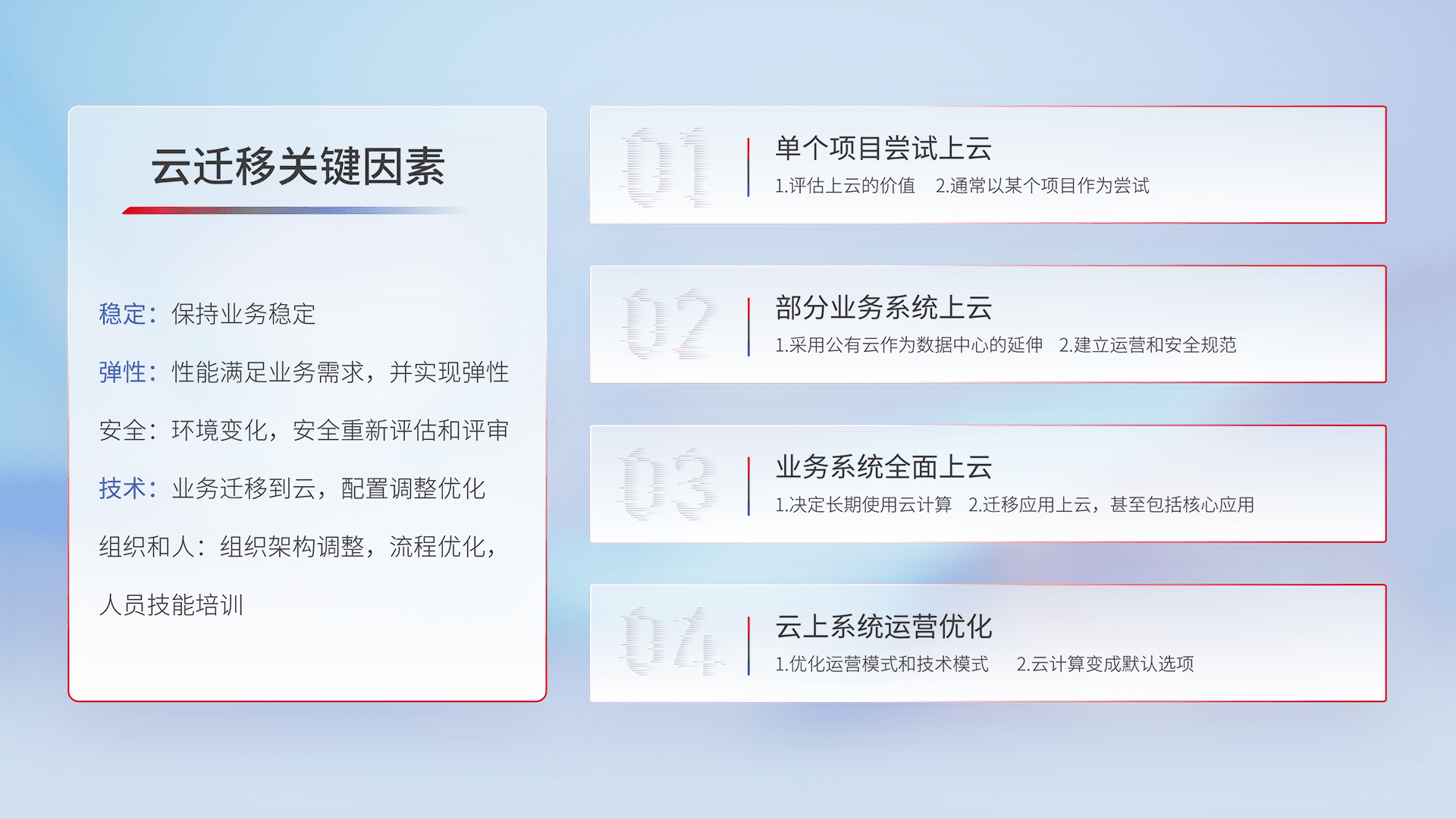 结合实际业务,,,,从规划设计、、、、云平台选型、、、云原生改造、、、数据迁移、、、集成交付,,,,迁移全过程为客户识别最佳上云路径,,,,做好风险识别管理,,设计网络架构、、身份权限、、安全审计合规、、、、操作审计、、日志审计、、、、监控告警策略、、、、多站点容灾设计等,,,对云上基础设施进行整体规划,,,提升IT治理水平,,以满足弹性、、高可用、、高性能的需求。。。
