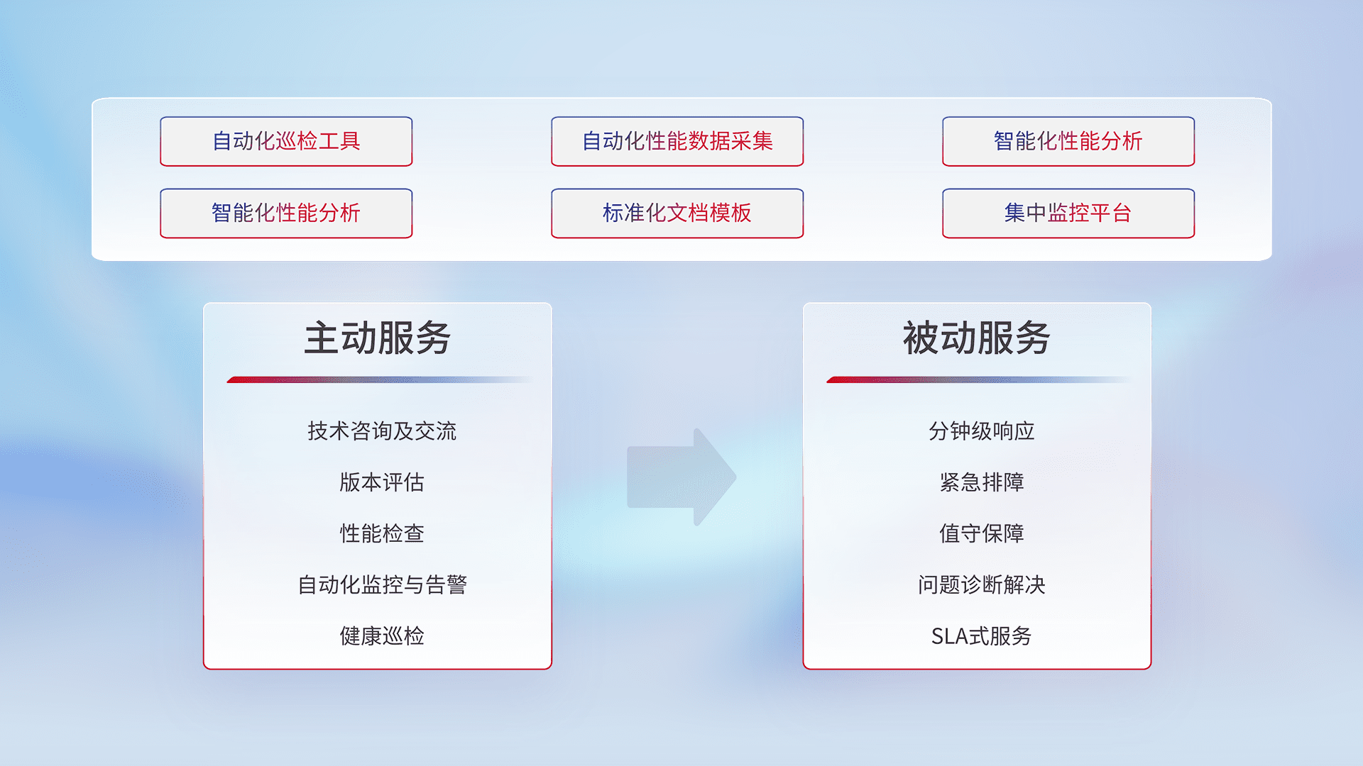 智能化工具和标准化文档,,,保障服务质量,,提供主动服务(包含技术咨询、、版本评估、、性能检查、、、自动化监控与告警、、、健康巡检)和被动服务包含(分钟级响应、、、、紧急排障、、、值守保障、、、、问题诊断解决、、SLA服务)。。
